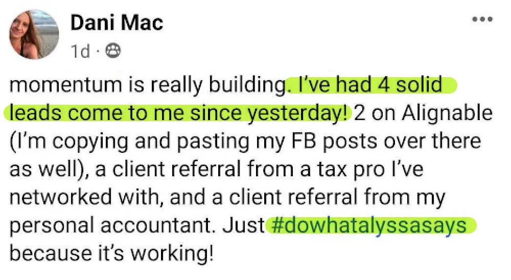 Simple, Effective NO COST Strategies: I’ll walk you through how to build a client-converting system on social media and email. You’ll leave knowing how to capture leads and nurture them into paying clients.